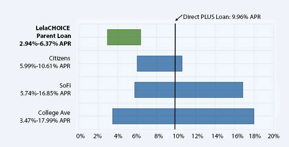 Compare our LelaCHOICE Parent Loan fixed APRs to parent loan fixed APRs offered by other private loan lenders. The ranges cover a variety of repayment options and include potential discounts.1 (Note: APRs are listed in ascending order of highest rate.)